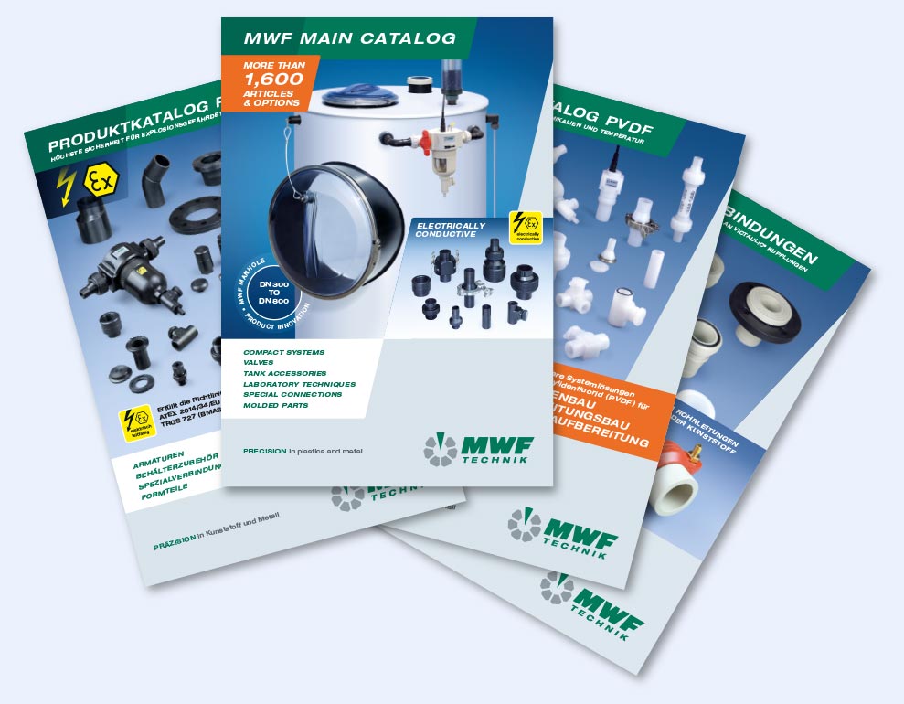 In the field of plastics technology, MWF Technik has been developing, manufacturing, and distributing a wide range of system components for many years. Application areas: distributing, measuring, and neutralizing chemical liquids. Our customers come from the chemical industry, water treatment, medical technology, and laboratory technology sectors. Our product catalogs now feature more than 2,000 items and options, divided into the product categories compact systems (mini neutralization plants), fittings, tank accessories, laboratory technology (sampling cabinets), special connections, molded parts, and electrically conductive components (PE-el). All product catalogs are also available as digital flipbooks and PDF downloads.