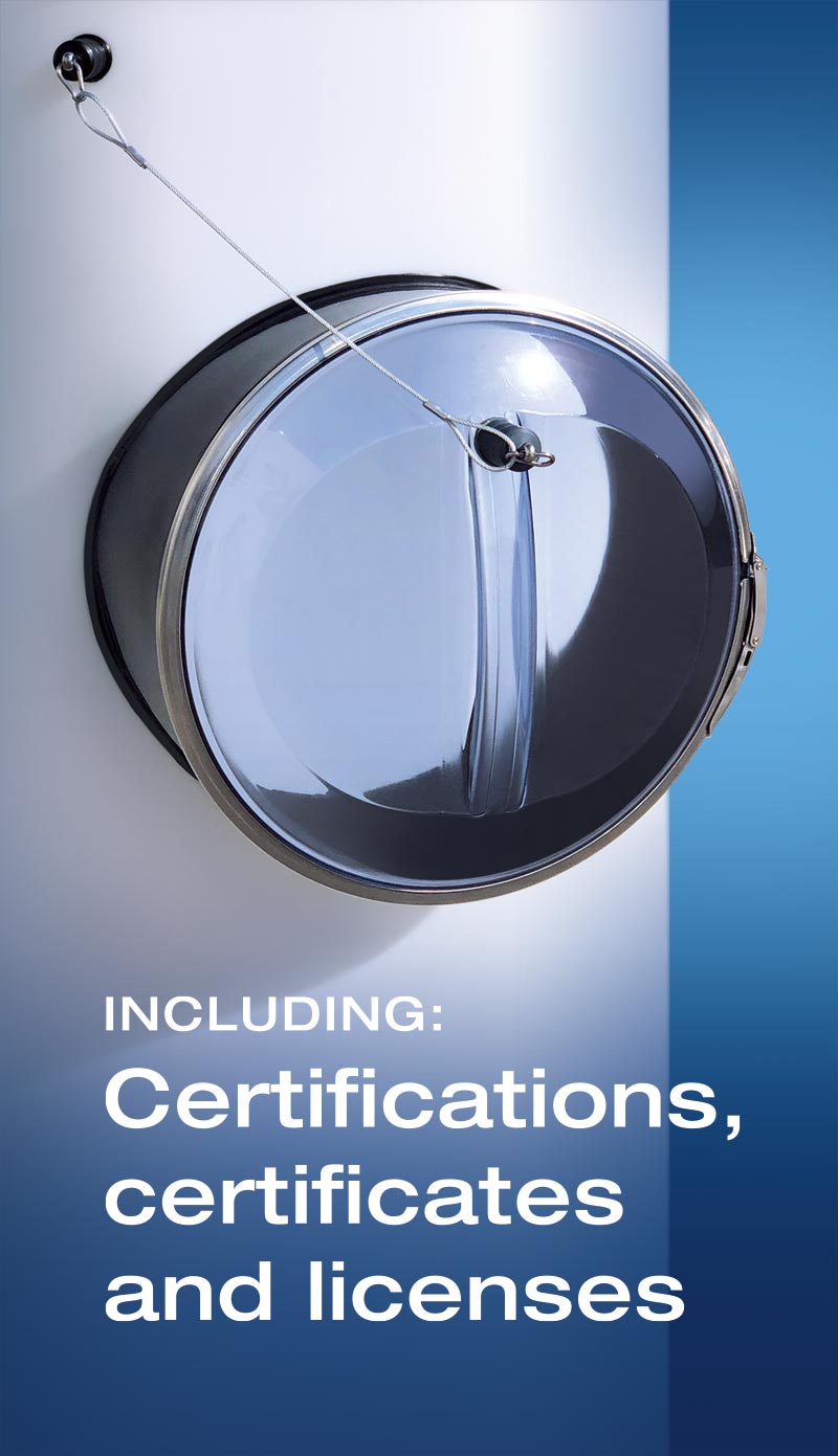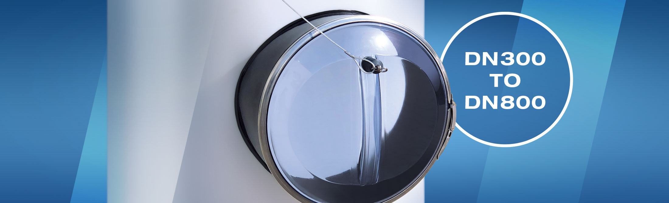The thermoformed cover is made from a single material (e.g., transparent PVC). Its ergonomic shape makes handling easier, and the handle gives the cover very high stability. The stainless steel clamping ring allows easy and quick opening and closing of the inspection opening. Once closed, the cover, seal, and flange form a secure and tight unit.